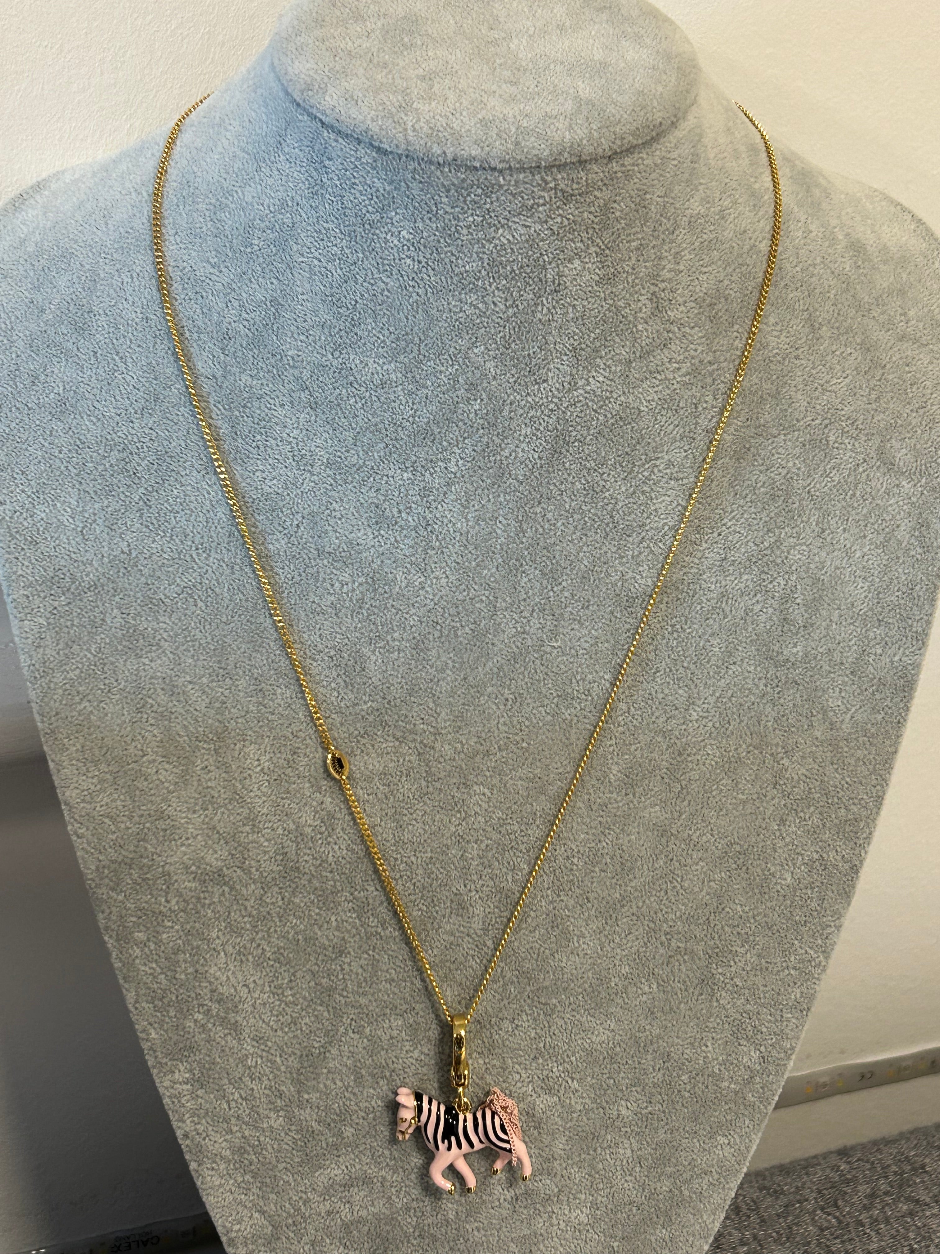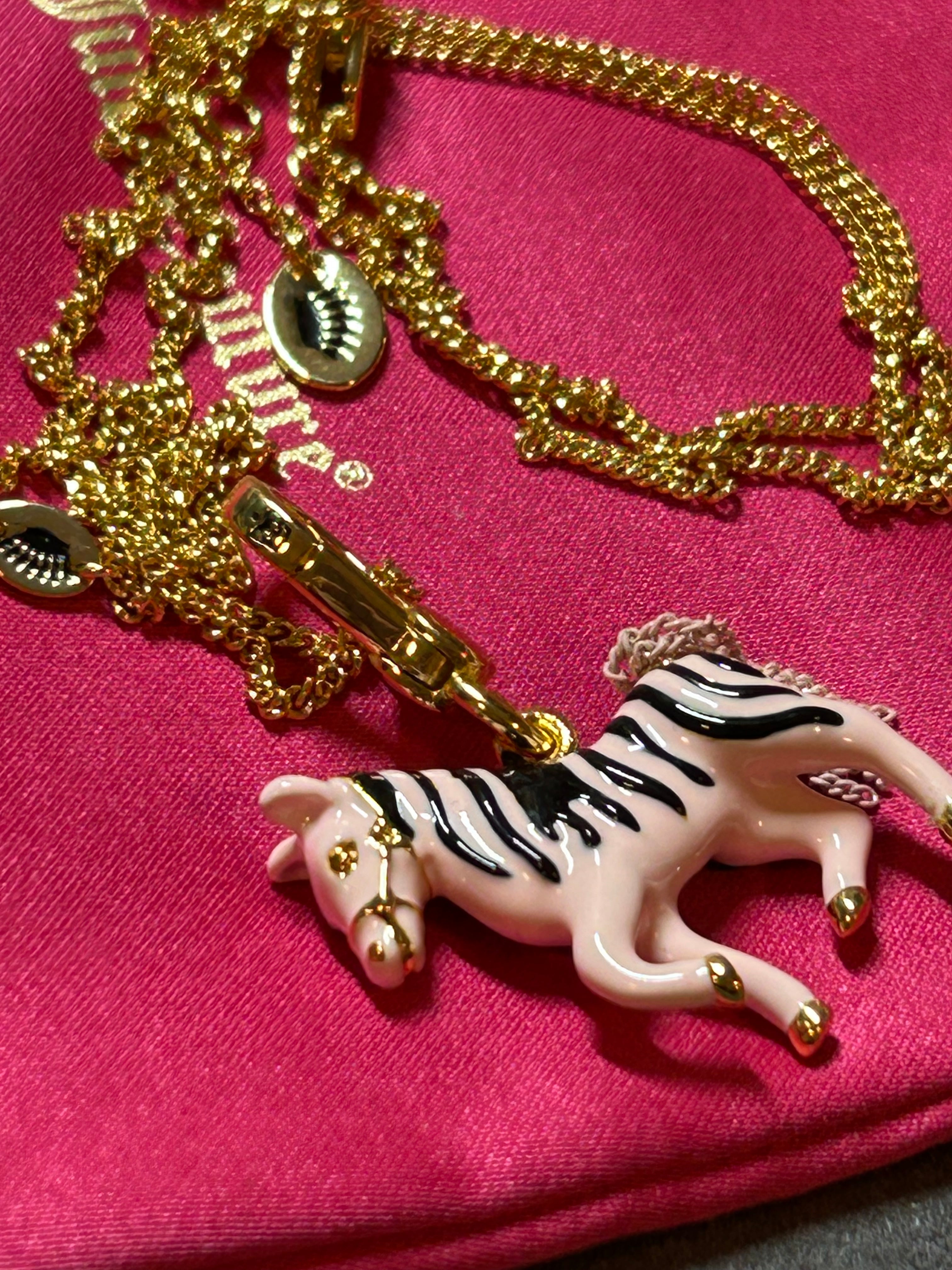 Juicy Couture long necklace.Gold-tone chain with adjustable length 60–66cm.Features the iconic pink zebra pendant with black stripes and gold details.
