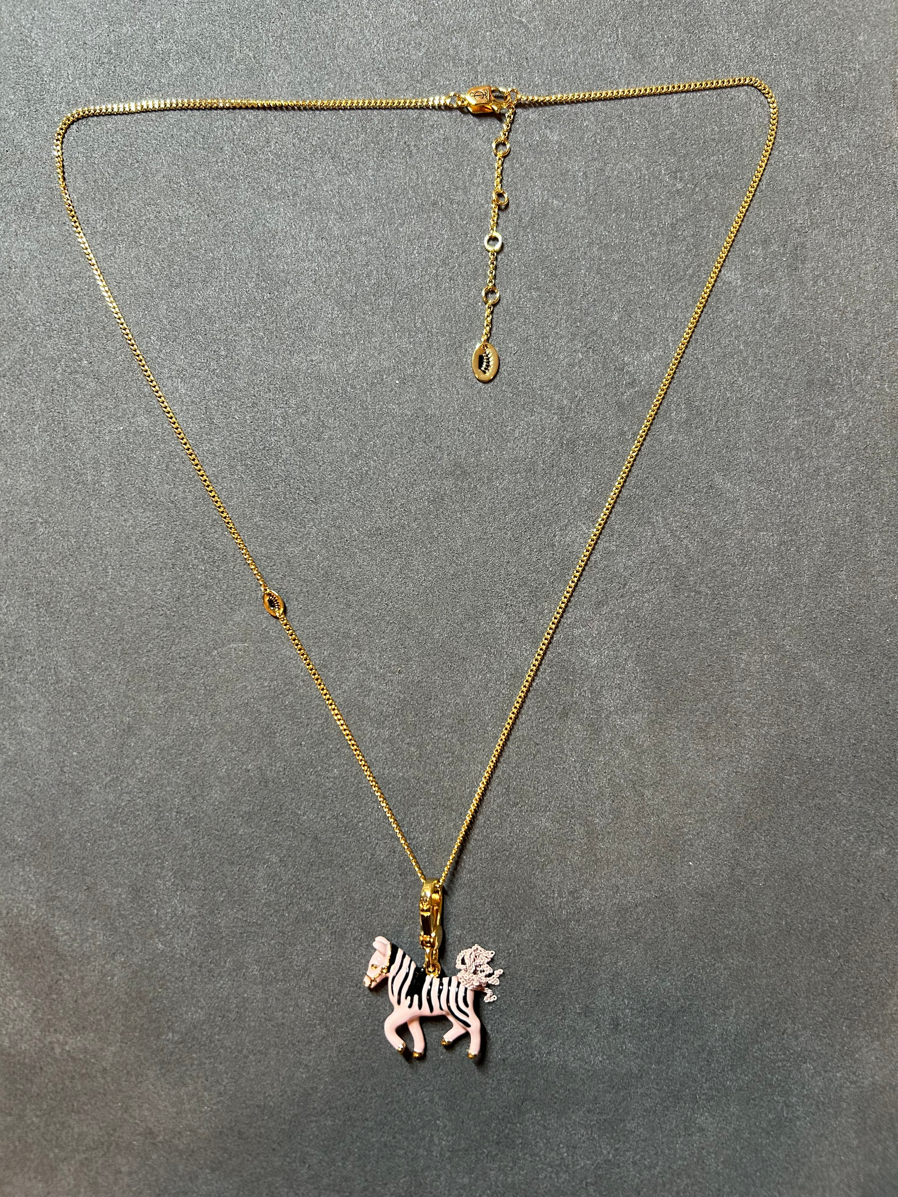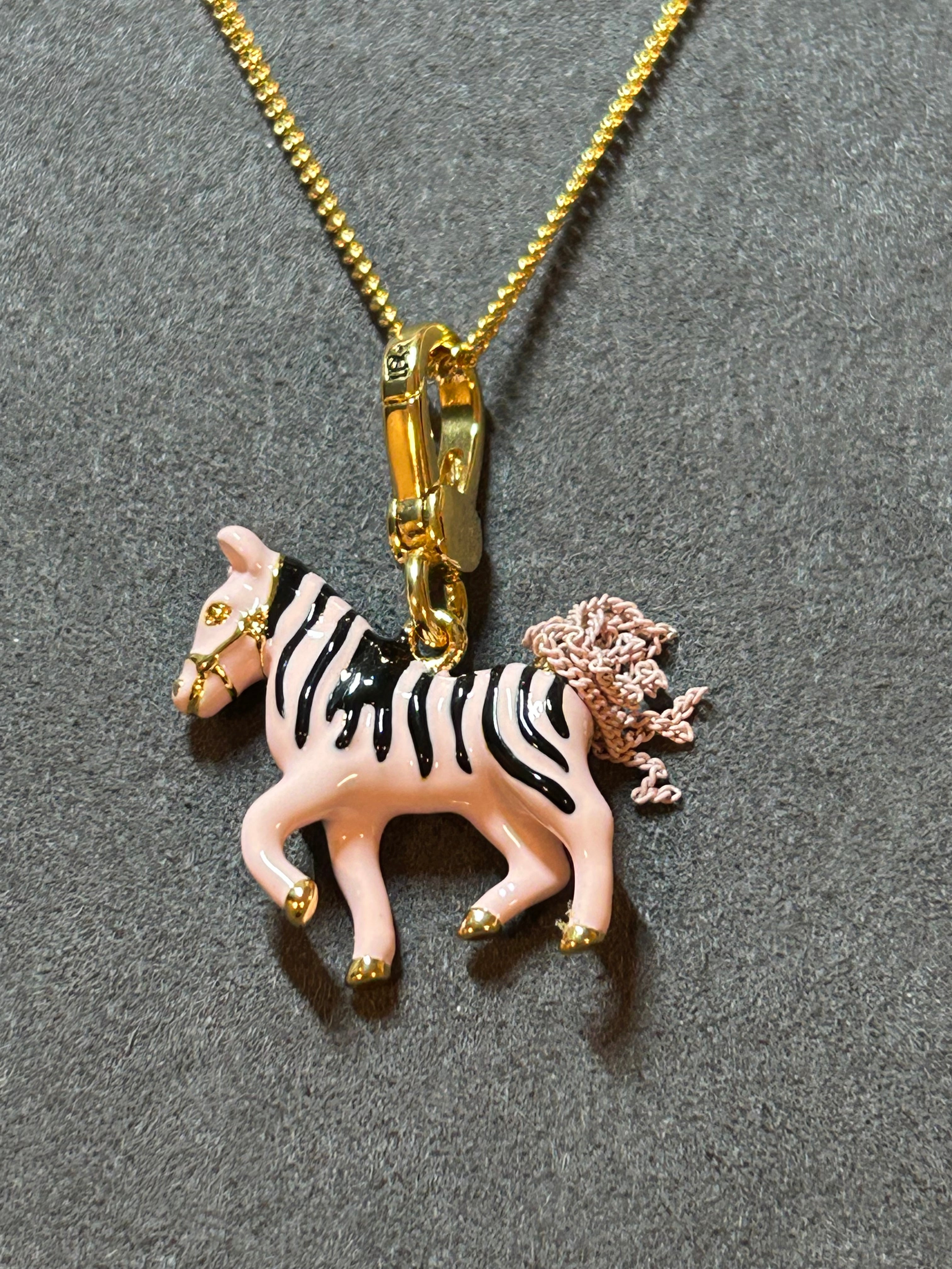 Features the iconic pink zebra pendant with black stripes and gold details.