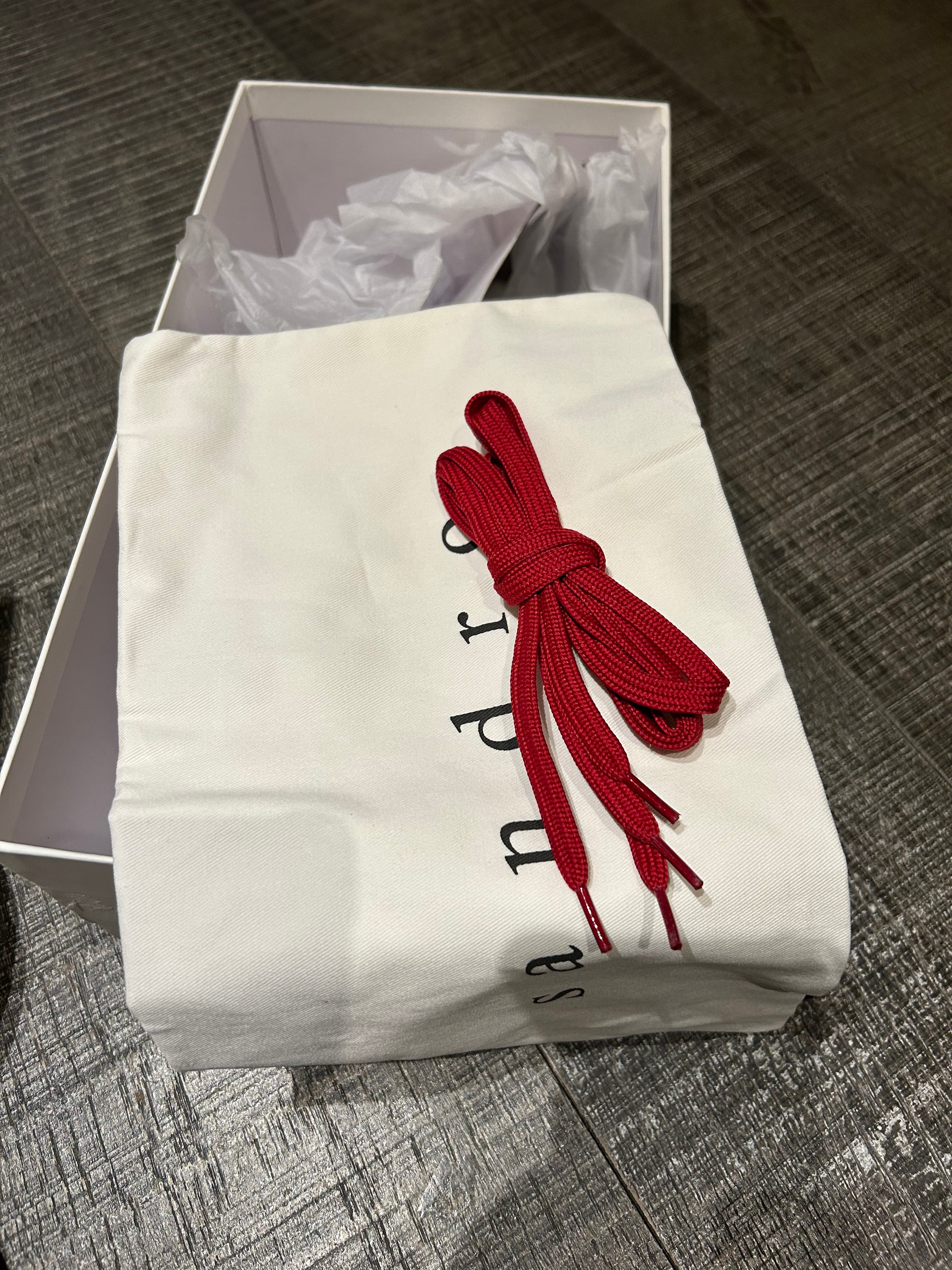 Comes complete with the original box, dust bag, and extra red laces.
